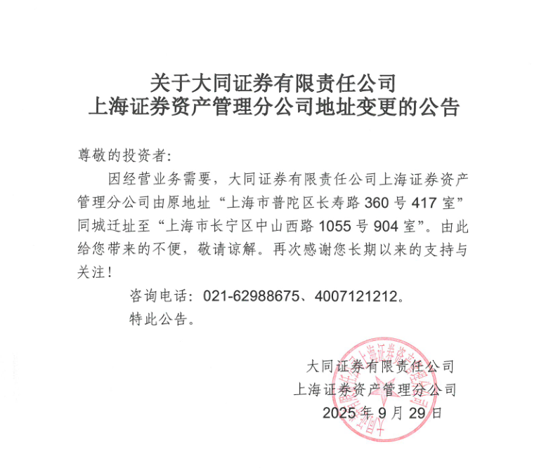 关于大同证券有限责任公司上海证券资产管理分公司地址变更的公告